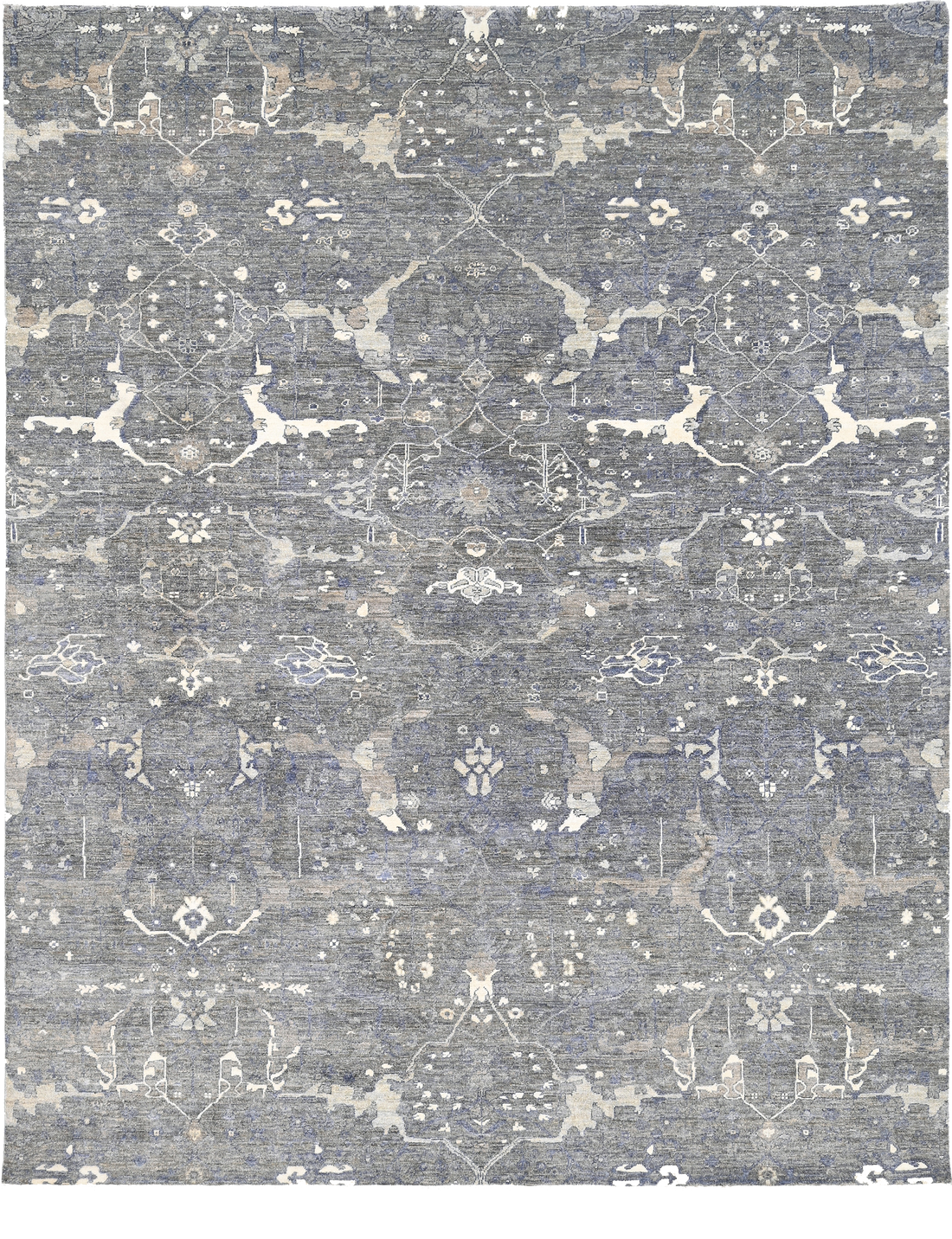 Hand knotted in a blend of fine wool and silk, Charcoal Lattice reinterprets the palmette...