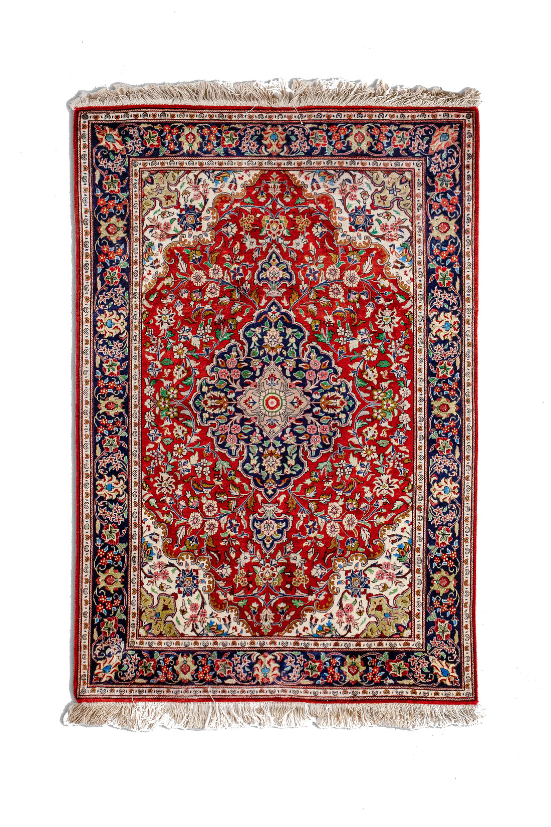 Collector's Note A mid-century Kashan silk of fine weave and glowing palette. The saturated red...