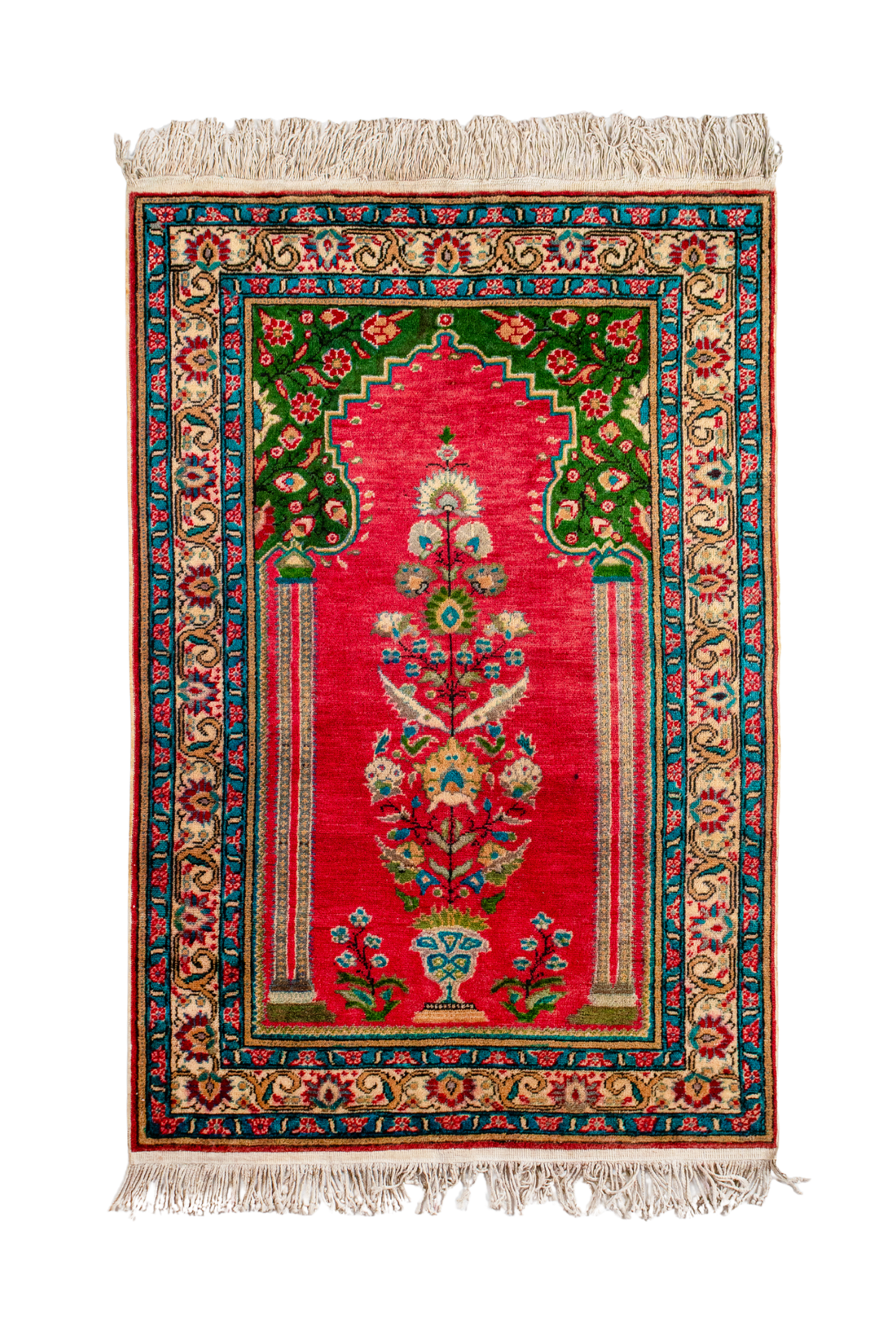 Collector's Note A mid-century Kashan silk of fine weave and glowing palette. The saturated red...