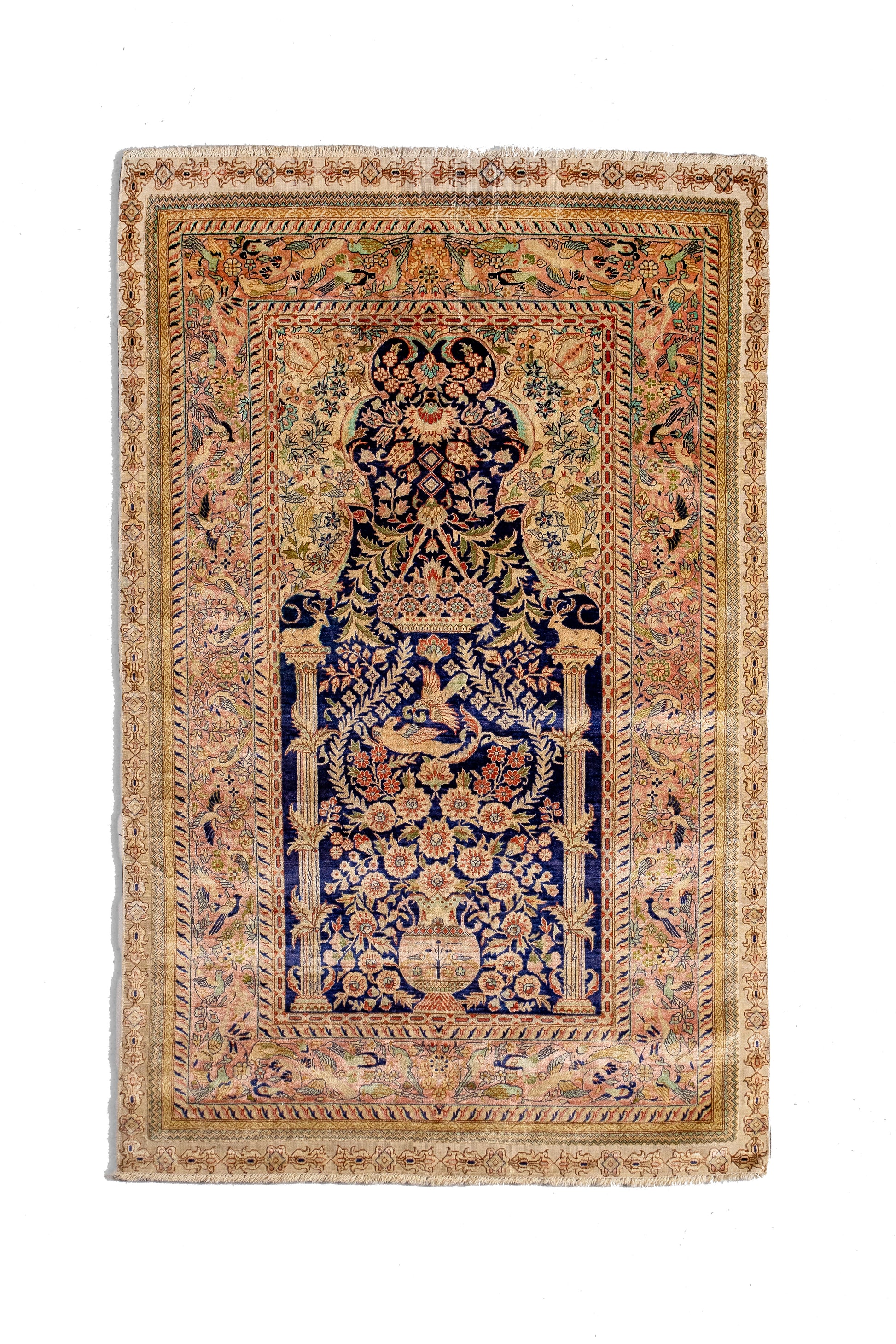 A mid-20th century Qom silk prayer rug, woven with exceptional finesse and meditative grace. Prayer-format Qoms of this quality (equal parts textile and devotion) are now scarce and highly regarded among collectors for their refinement and contemplative beauty. To fully appreciate its play of color and sheen, a video is recommended.