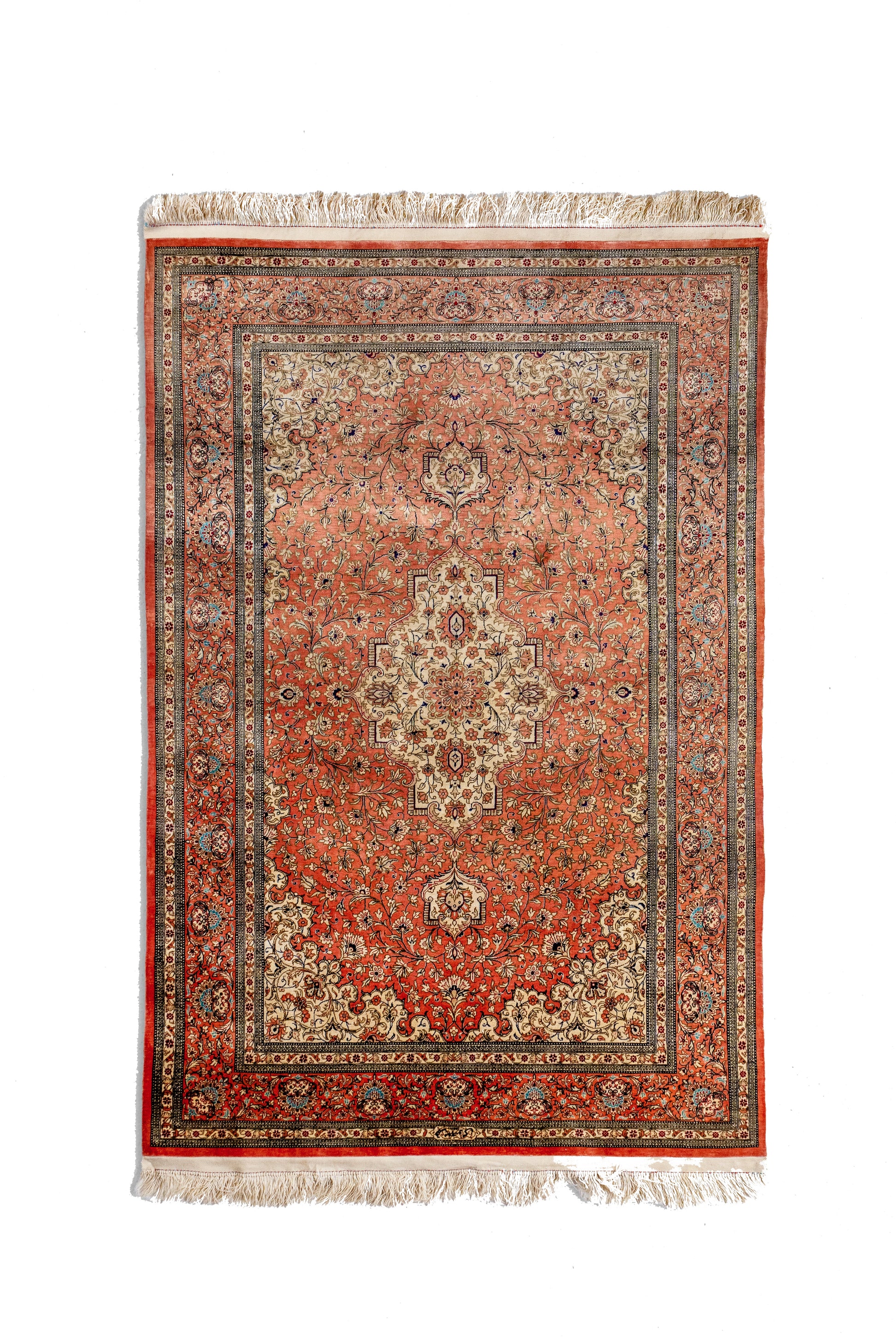 700 KPSI. The colour shifts with the light, moving from salmon to rose gold, a chromatic play unique to Qom silks of this period. Such examples are now scarce on the market and remain highly prized for their precision and iridescence. To fully appreciate its quality, kindly request a video, as the silk’s reflective surface transforms with movement.