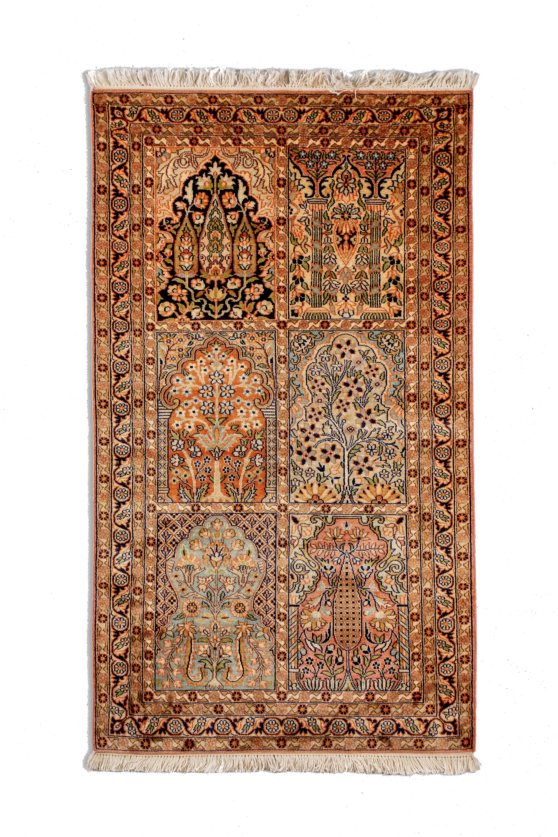 A finely woven garden-panel rug composed of six compartments, each depicting stylized trees and floral motifs arranged in a balanced, symmetrical layout. The design follows the classical Persian chahar bagh concept, where gardens are represented as enclosed reflections of paradise.
