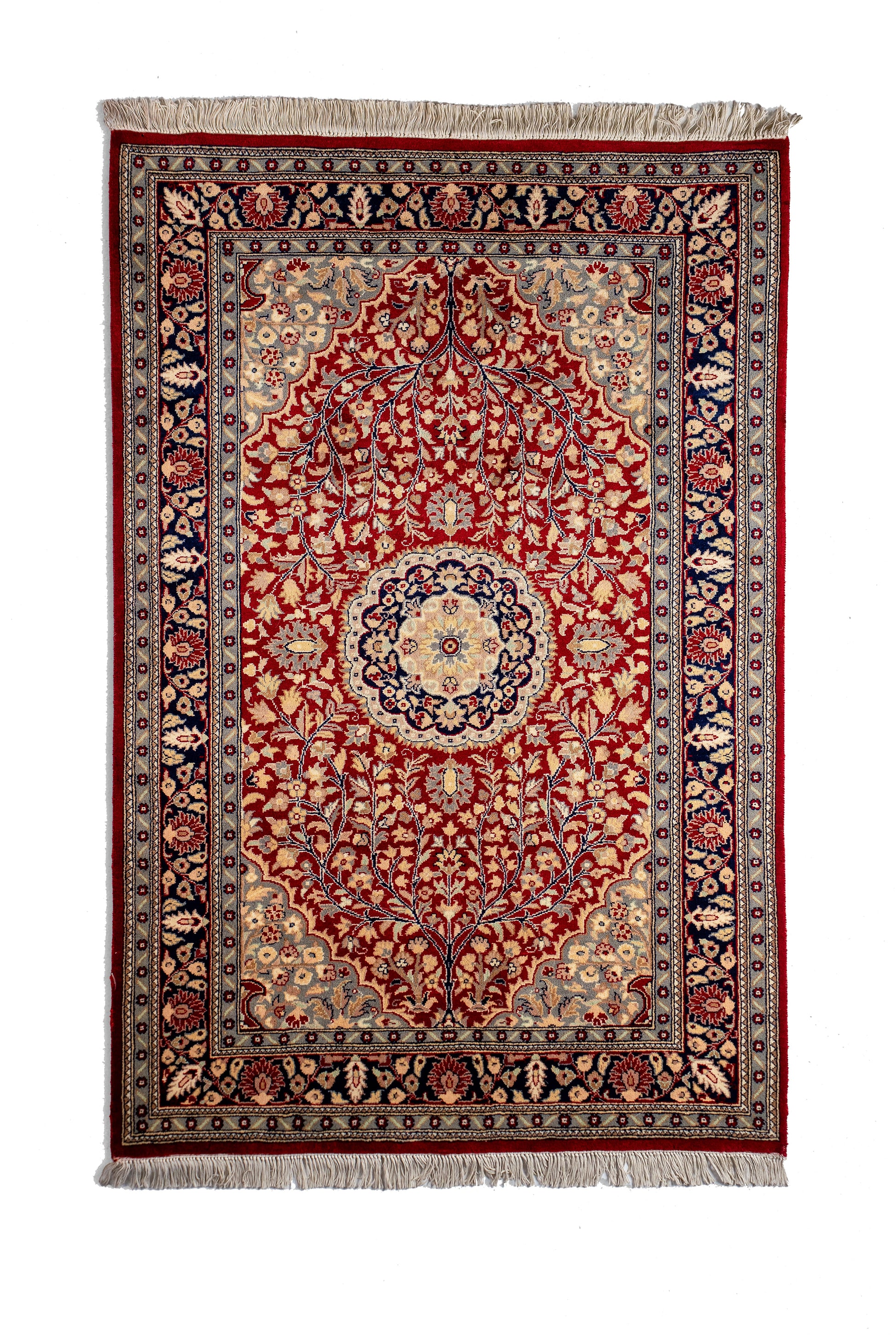 The palette of deep carnelian red, ivory, and indigo blue is characteristic of Kashan’s classical tradition, while the fine kurk wool lends the surface a gentle sheen and supple texture. The precision of its drawing and the poise of its symmetry speak to a period when Kashan weavers continued to uphold the standards of their Safavid heritage even as modernity approached.