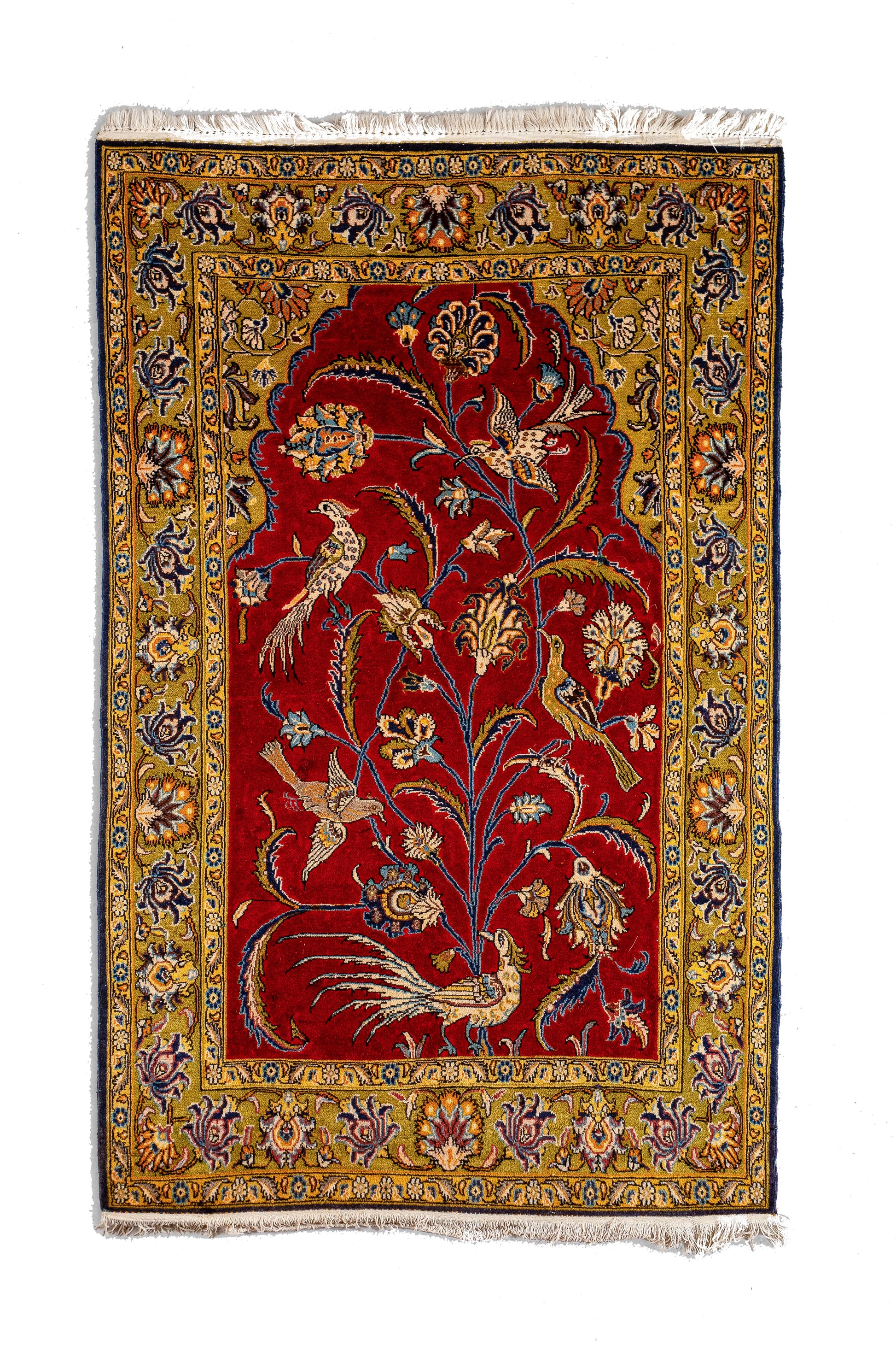A finely woven Kashan pictorial rug, Bāgh e Parandegān or The Garden of Birds, exemplifies the poetic artistry of mid century Persian weaving. The design centers on a Tree of Life, its branches animated by perched birds and delicate blossoms, a classical Persian motif symbolizing paradise and renewal.