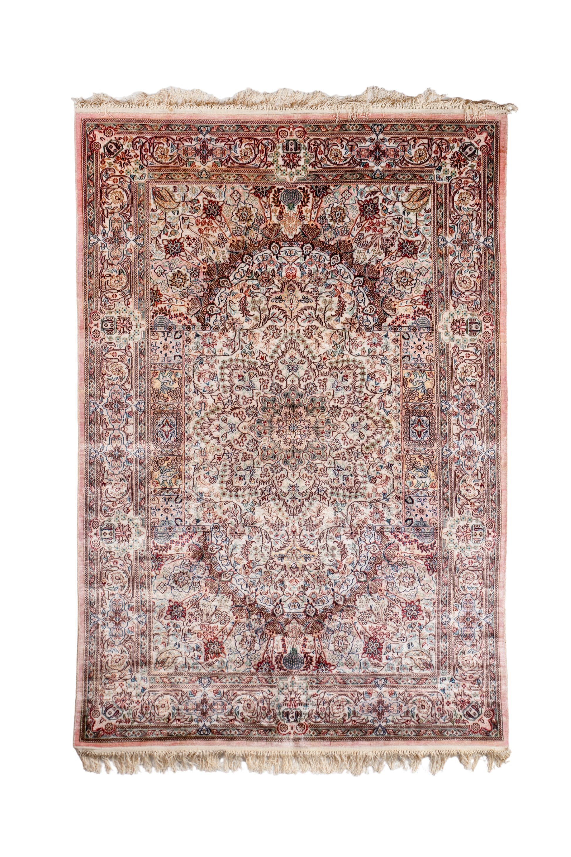 Woven at 616 KPSI, this piece is very camera shy, a piece that comes alive only in light and in person. The surface shimmers from blush to silver as one moves around it, an optical poetry unique to Isfahan silks of this era. Slight irregularities in the image are tricks of reflection, not wear as the rug itself remains beautifully intact and impossibly soft to touch. Request a video to truly understand its grace; it reveals itself only to the eye, not the lens.