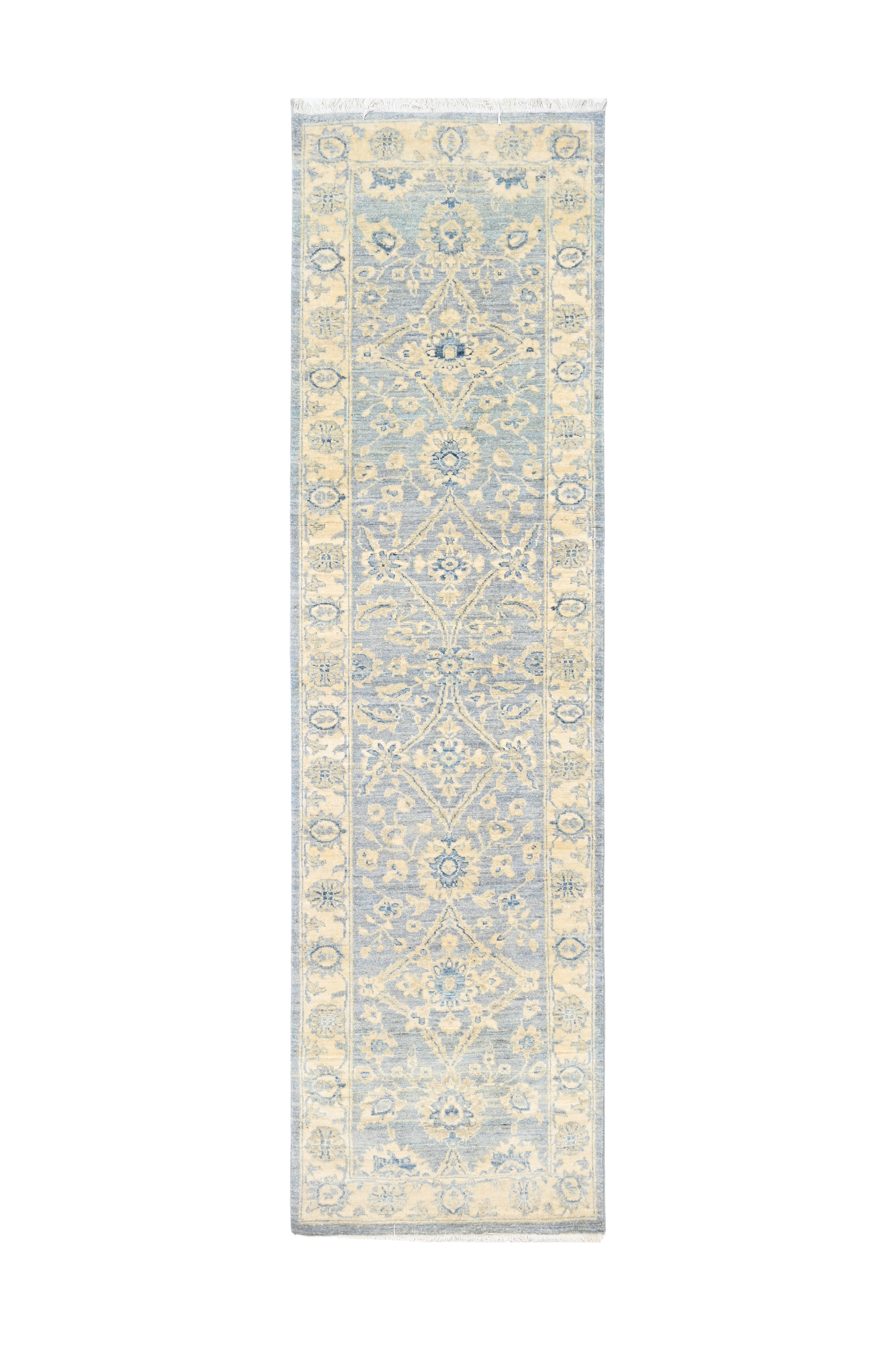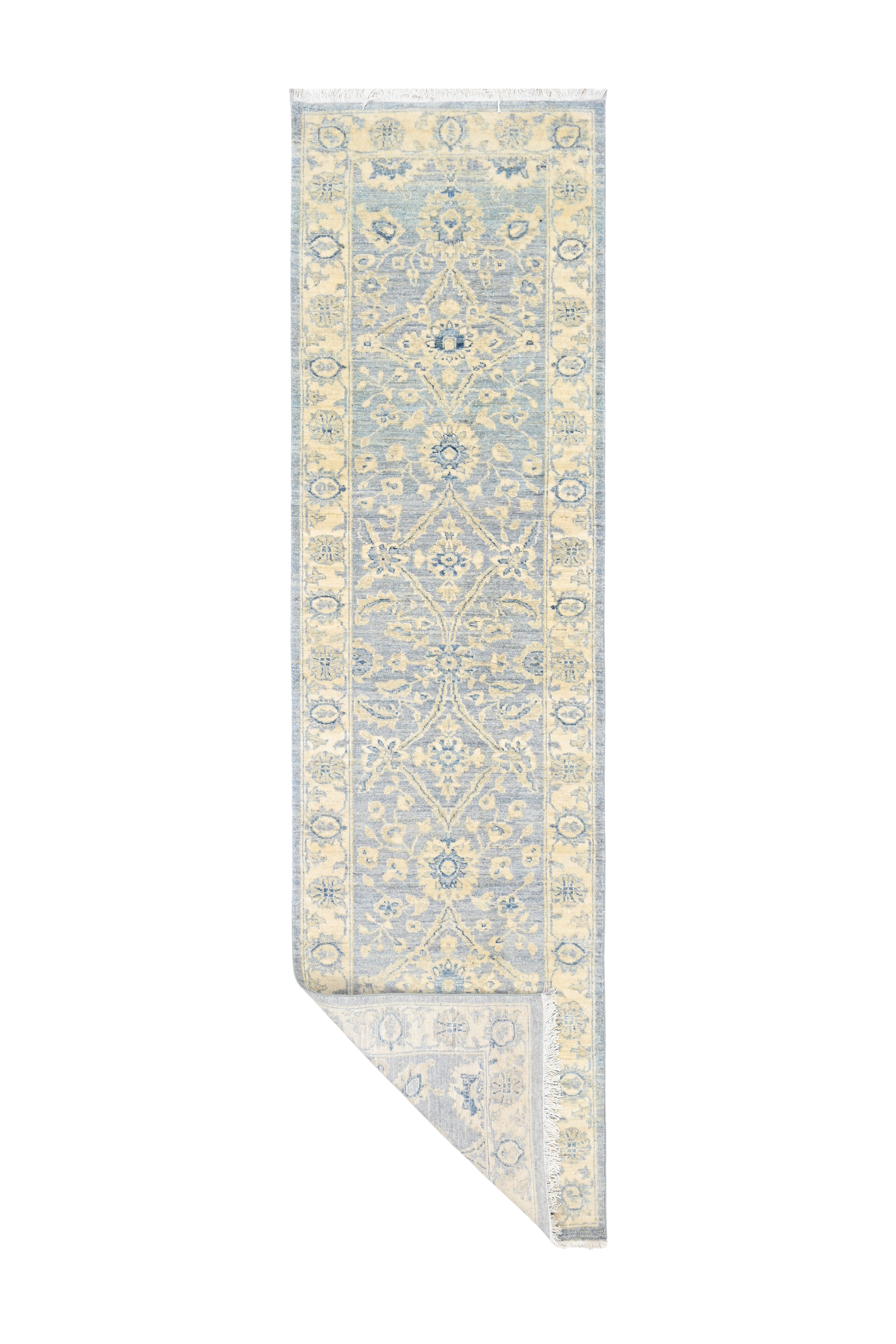 Blue Veil is a hand knotted wool runner woven in a soft palette of pale blue and cream. Crafted using traditional Oushak weaving techniques, the runner features loosely spun wool and an open knot structure that give it a light, pliable handle. A gentle wash applied after weaving softens the outlines of the motifs, creating the diffused, luminous look characteristic of contemporary Oushak pieces.