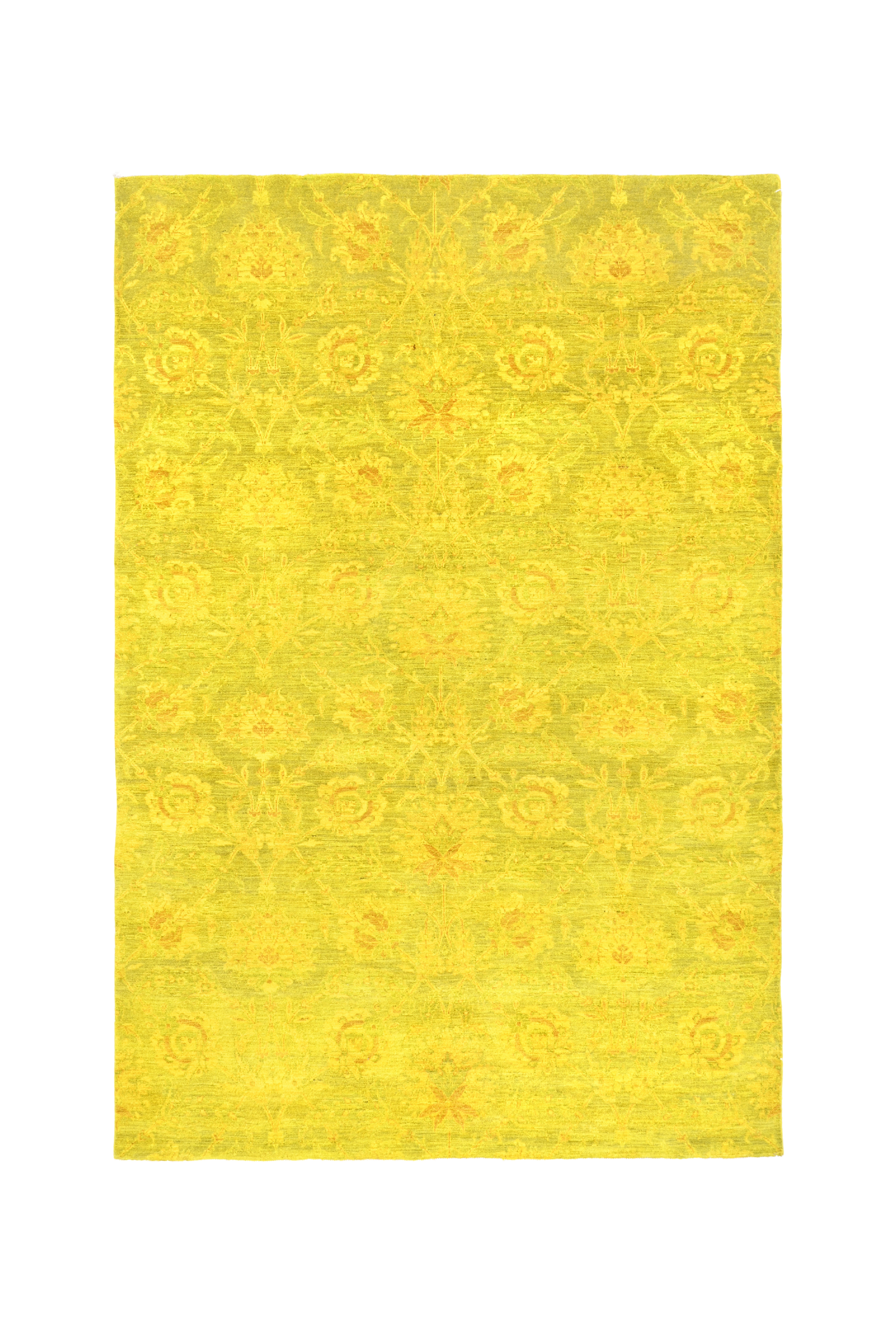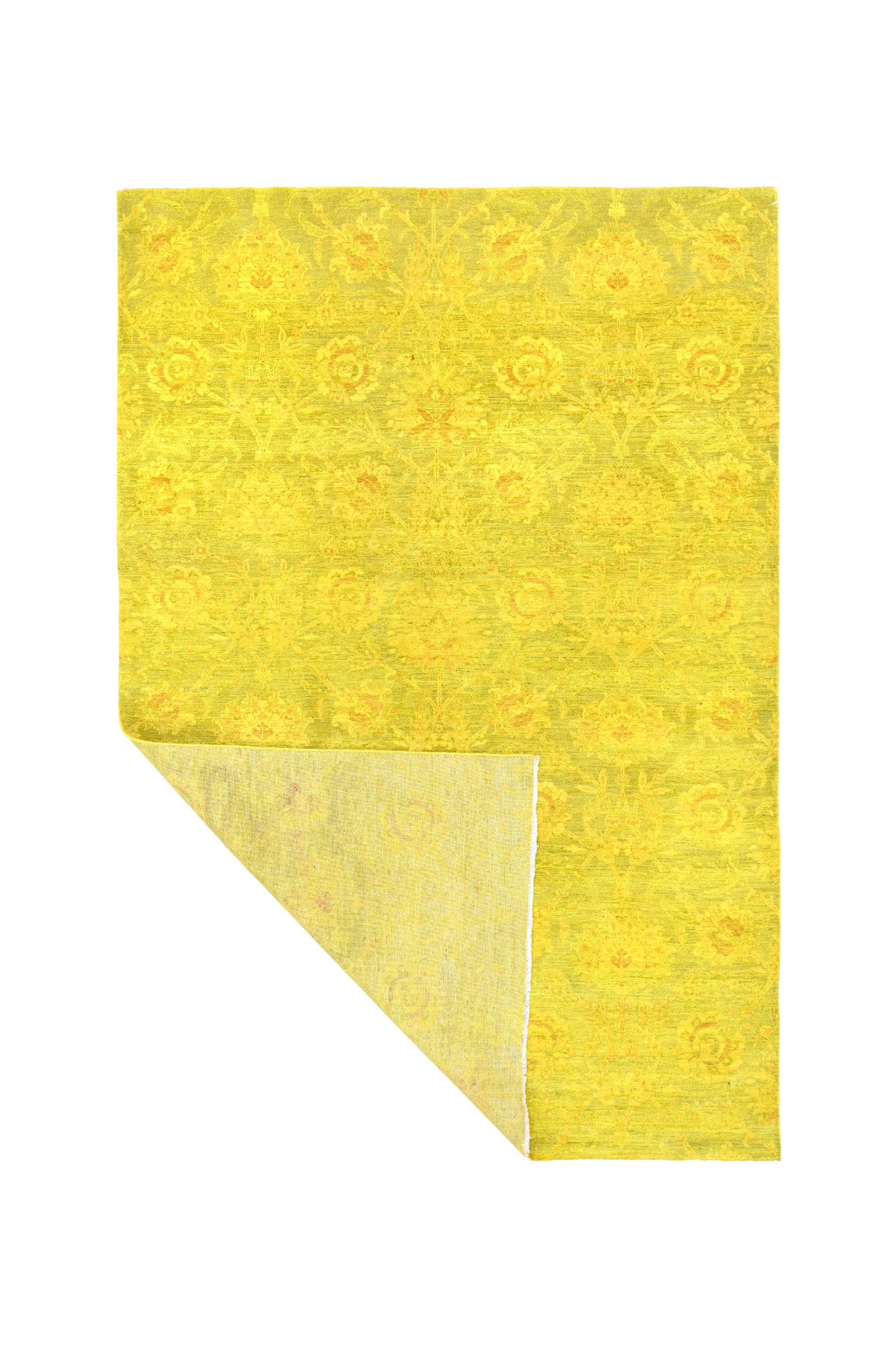 Golden Saff is an overdyed wool and silk masterpiece that feels like sunlight captured in weave. The silk catches the light with a liquid shimmer, while the wool grounds it in soft, matte warmth. Dyed in layers of natural saffron and pomegranate rind, the palette moves between shades of gold, amber, and pale honey, glowing differently through the day. The design draws from an antique Persian floral lattice, but through repeated washing and overdying. What remains is atmosphere: luminous, textural, alive.
